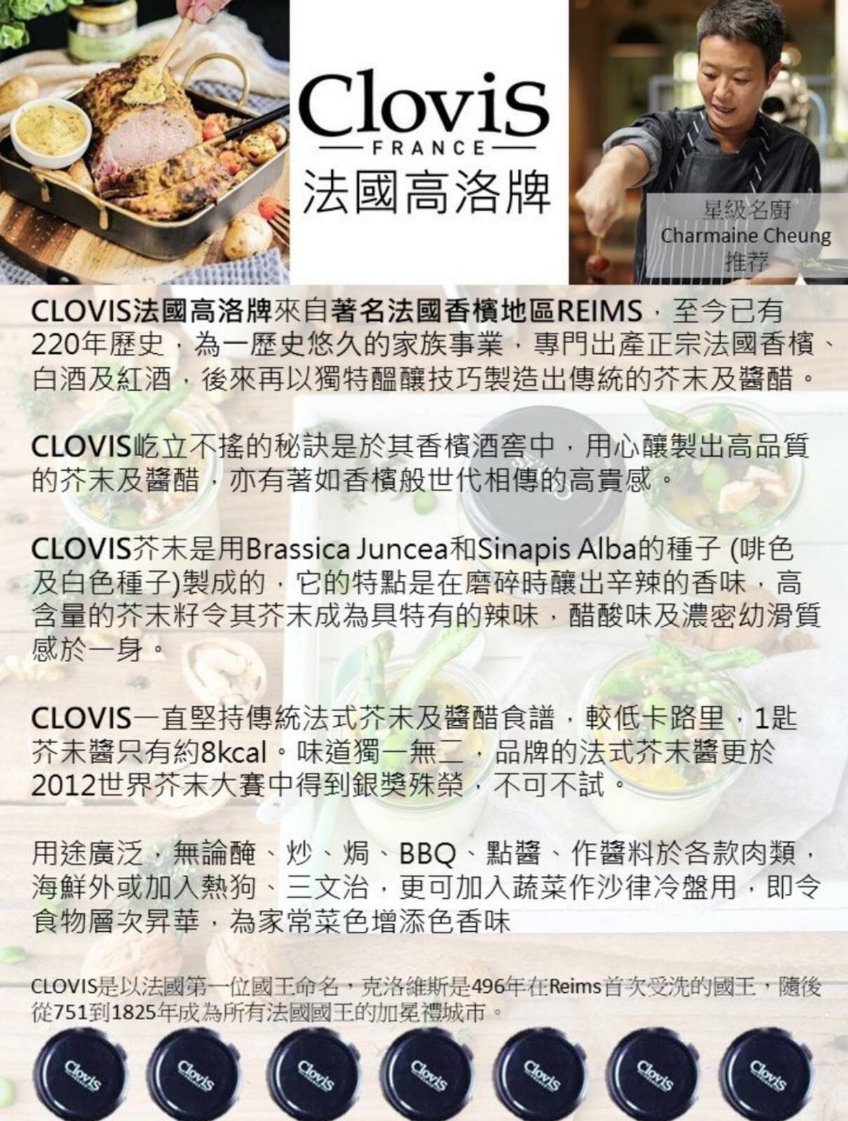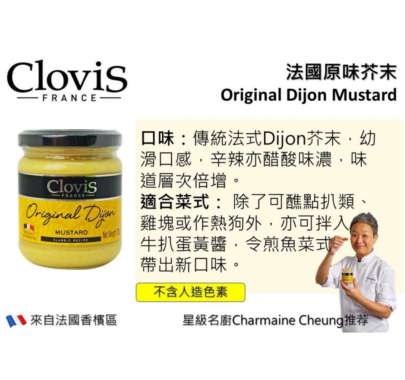 CLOVIS芥末醬味道獨一無二,用途廣泛,除可作醬料於各款肉類,海鮮外,更可加入蔬菜作沙律冷盤用。法式芥末醬於2012世界芥末大賽中得到銀獎殊榮,不可不試。口味:傳統法式Dijon芥末,幼滑口感,辛辣亦醋酸味濃,味道層次倍增。適合菜式:除了可醮點任何扒類如牛扒雞扒羊扒、雞塊或作熱狗外,亦可煮成汁料,只需一點點加入汁料拌勻,便能令菜式帶出新口味