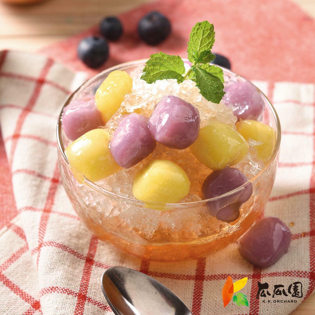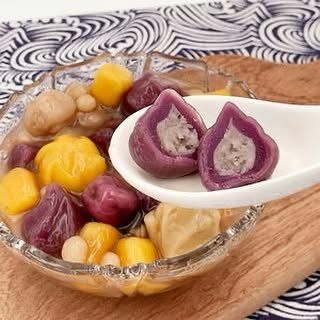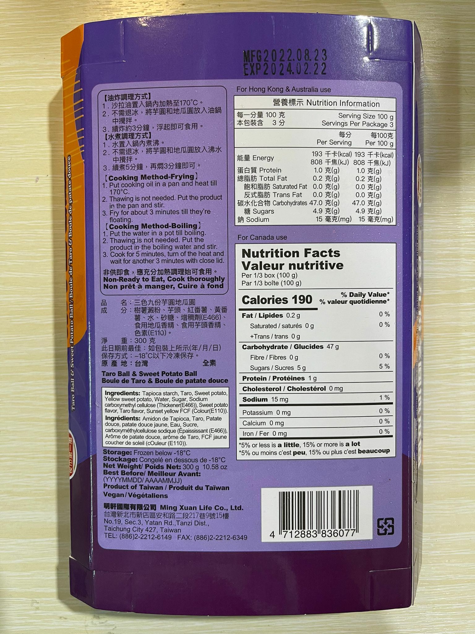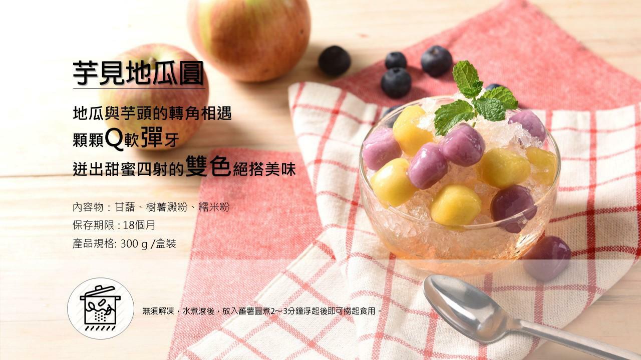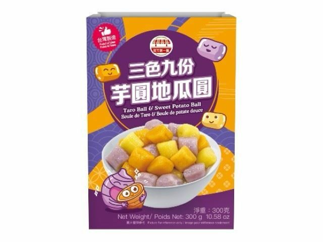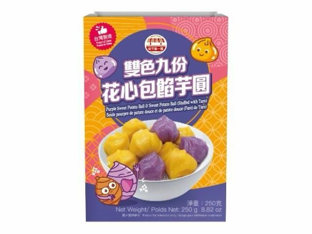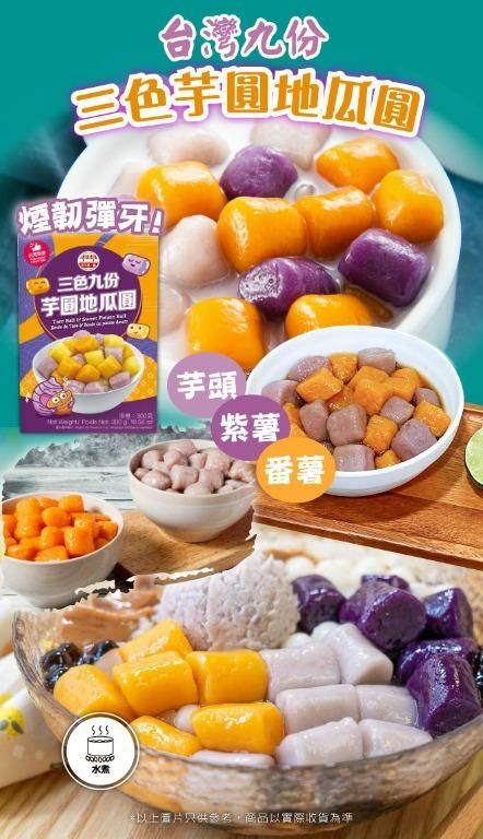 三色九份芋圓地瓜圓:(芋頭、紫薯、番薯)雙色花生餡芋圓:(芋圓及地瓜圓)地瓜與芋頭的轉角相遇黃地瓜與紫芋頭的轉角美麗相遇,原料選用瓜瓜園農場健康優質的台農57號黃地瓜,以及結合台灣小農細心栽作的夢幻紫芋頭,用料實在、無添加色素,顆顆小巧方圓、Q軟彈牙,在你口中迸出甜蜜四射的雙色絕搭美味。建議煮法油炸-約170度油溫炸3分鐘到浮起(無需另外融雪)水煮-沸水煮5分鐘(邊煮邊攪)再停火焗3分鐘(無需另外融雪)