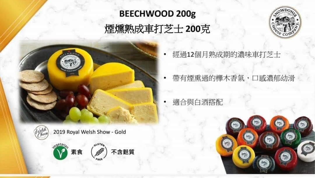 經過12個月熟成期嘅車打芝士,帶有煙燻過嘅櫸木香氣,口感濃郁幼滑!適合配白酒!