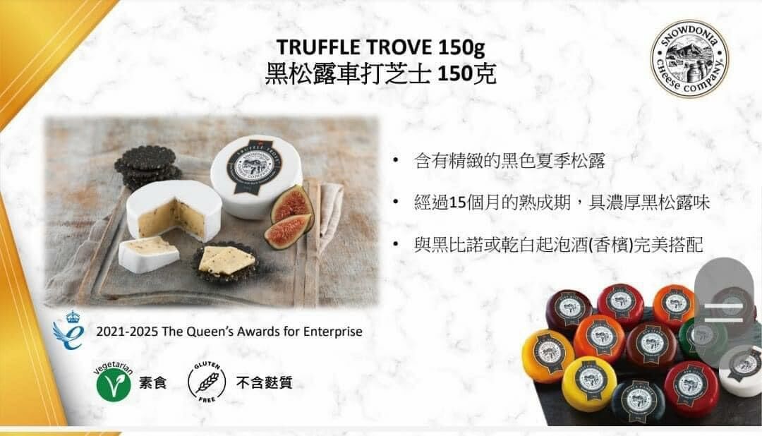 含有黑色夏季松露,經過15個月嘅熟成期,具有濃厚嘅松露味!可以搭配黑比諾(紅酒)或者香檳一齊享用!