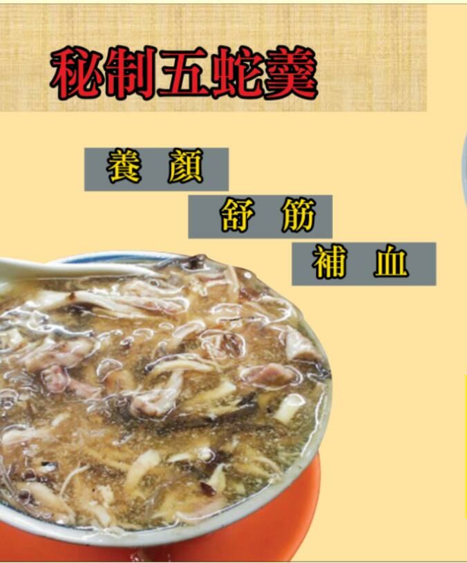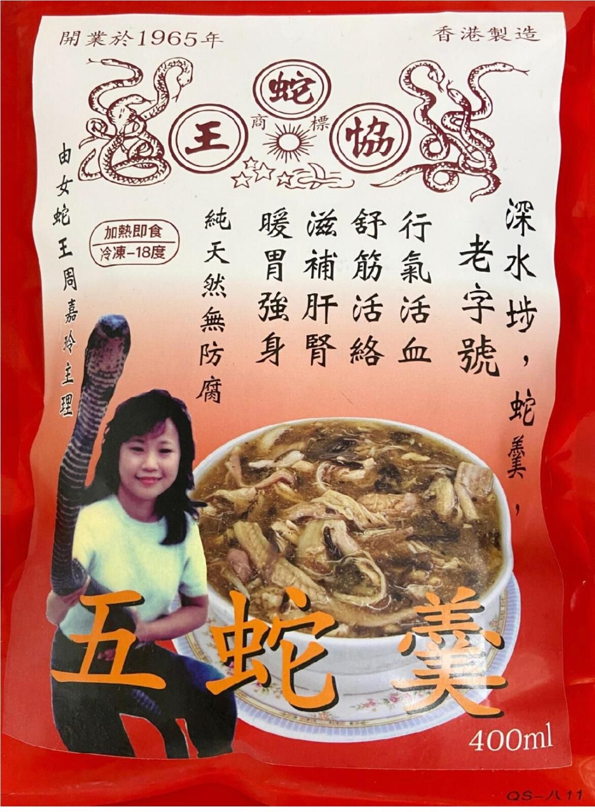 蛇王協老字號五蛇羹(急凍)五蛇羹以合稱「五蛇」的眼鏡蛇、金腳帶、過樹榕、三索蛇、百花蛇熬成蛇湯,吃時加入薄脆,增添風味!簡介蛇羹是傳統滋補又美味的高級食物。蛇肉膽固醇低,營養豐富,含有人體必需的氨基酸及礦物質。功效蛇:腿風濕、舒筋活絡、滋補肝賢、強健筋量。薑:驅寒開胃。黑木耳一一含豐富水溶性纖維,幫助體內膽固醇代謝,保養心血管健康,有益腸胃。