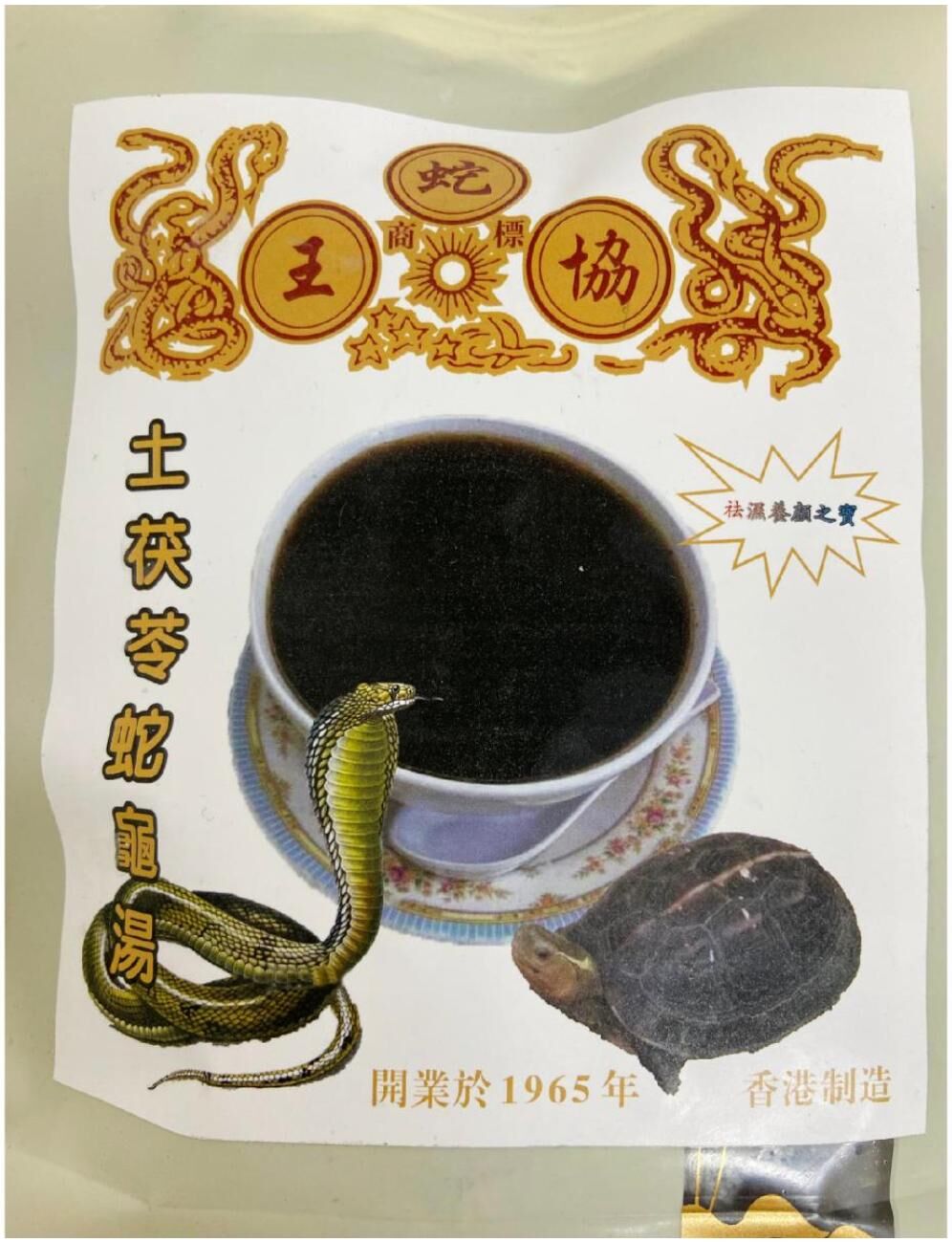 蛇王協老字號土茯苓蛇龜湯(急凍)土茯苓蛇龜湯強力清熱解毒,滋陰袪濕。此湯有袪濕毒、防治腫瘤的功效,祛皮膚濕毒功效強無添加味精(NO MSG Added )無防腐劑 ( NO Preservatives Added )無添加人造色素 (No Artificial Colours Added)