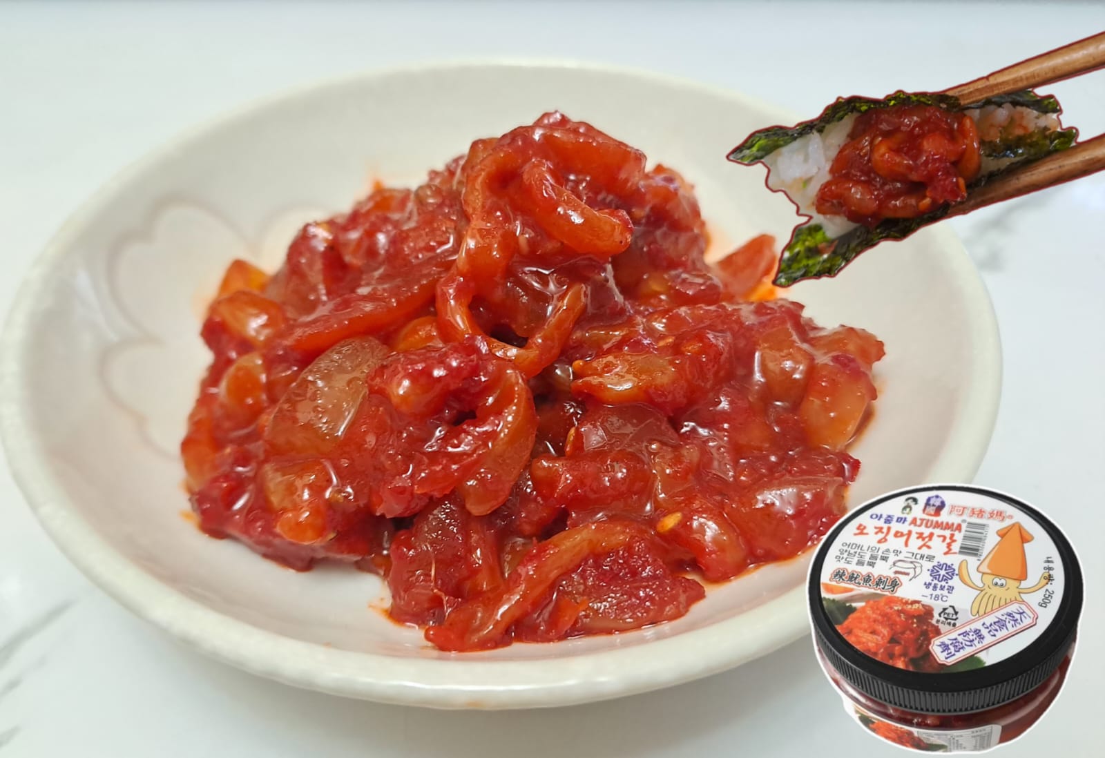 生醃辣魷魚添加咗阿豬媽硏發嘅鮮美調料之後,口感更加清爽美味!