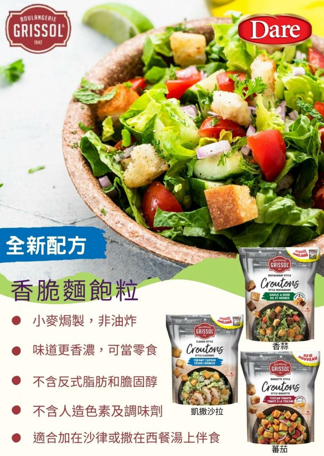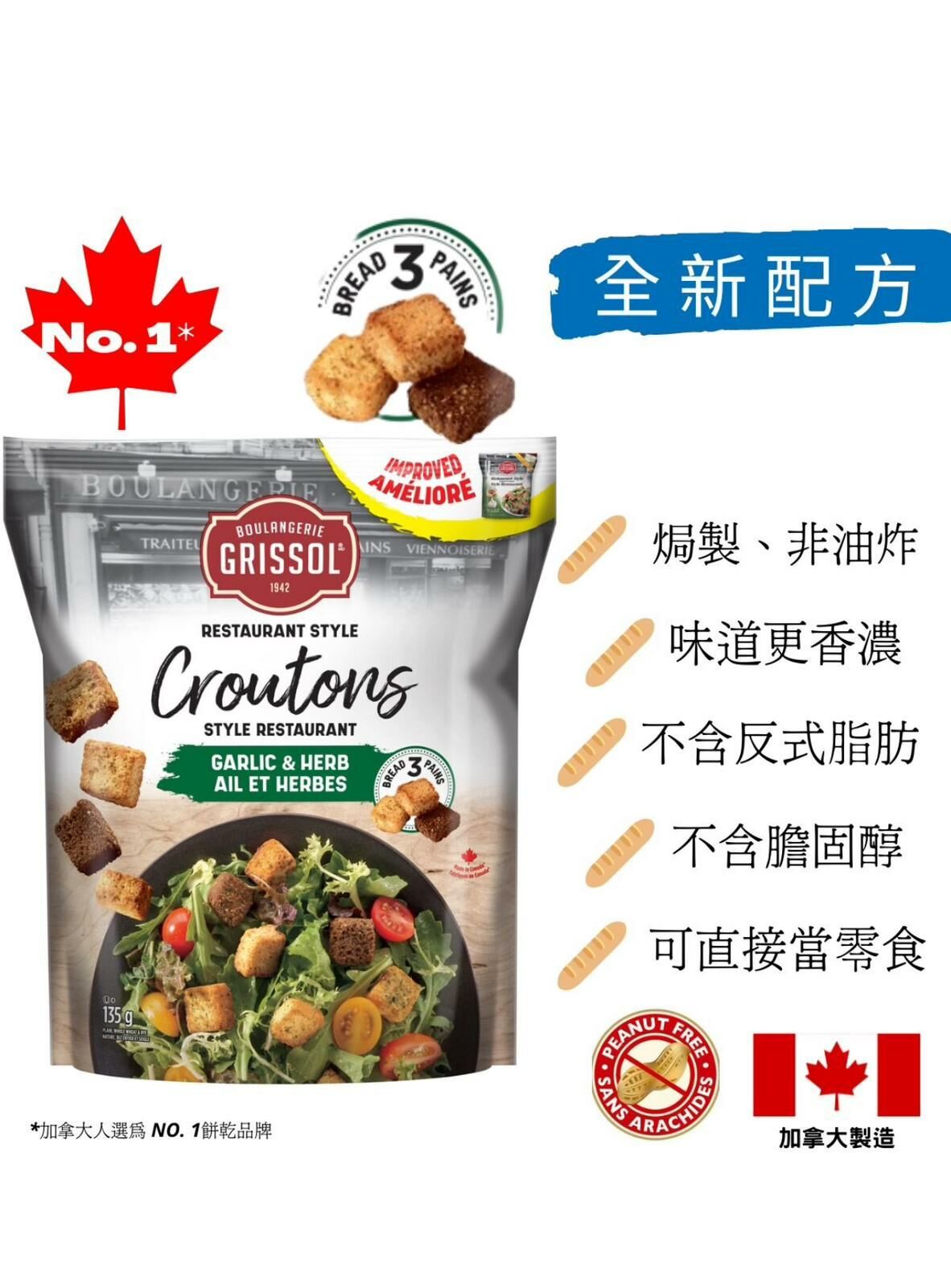 規格:135g 產地:加拿大 加拿大凱瑟香脆麵包粒 焗製、非油炸,加拿大心臟協會認證 不含反式脂肪,不含膽固醇 低脂、不含人造色素及調味劑 適合加在沙律或撒在西餐湯上伴食,當零食均可!