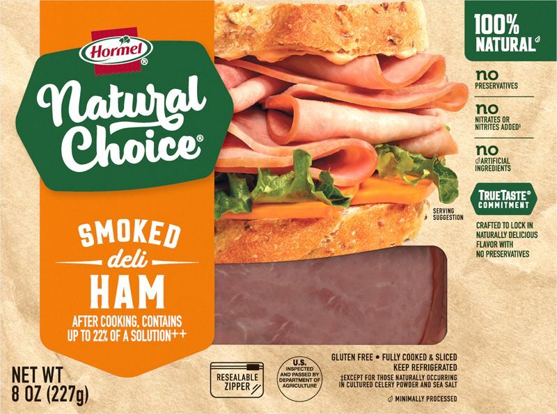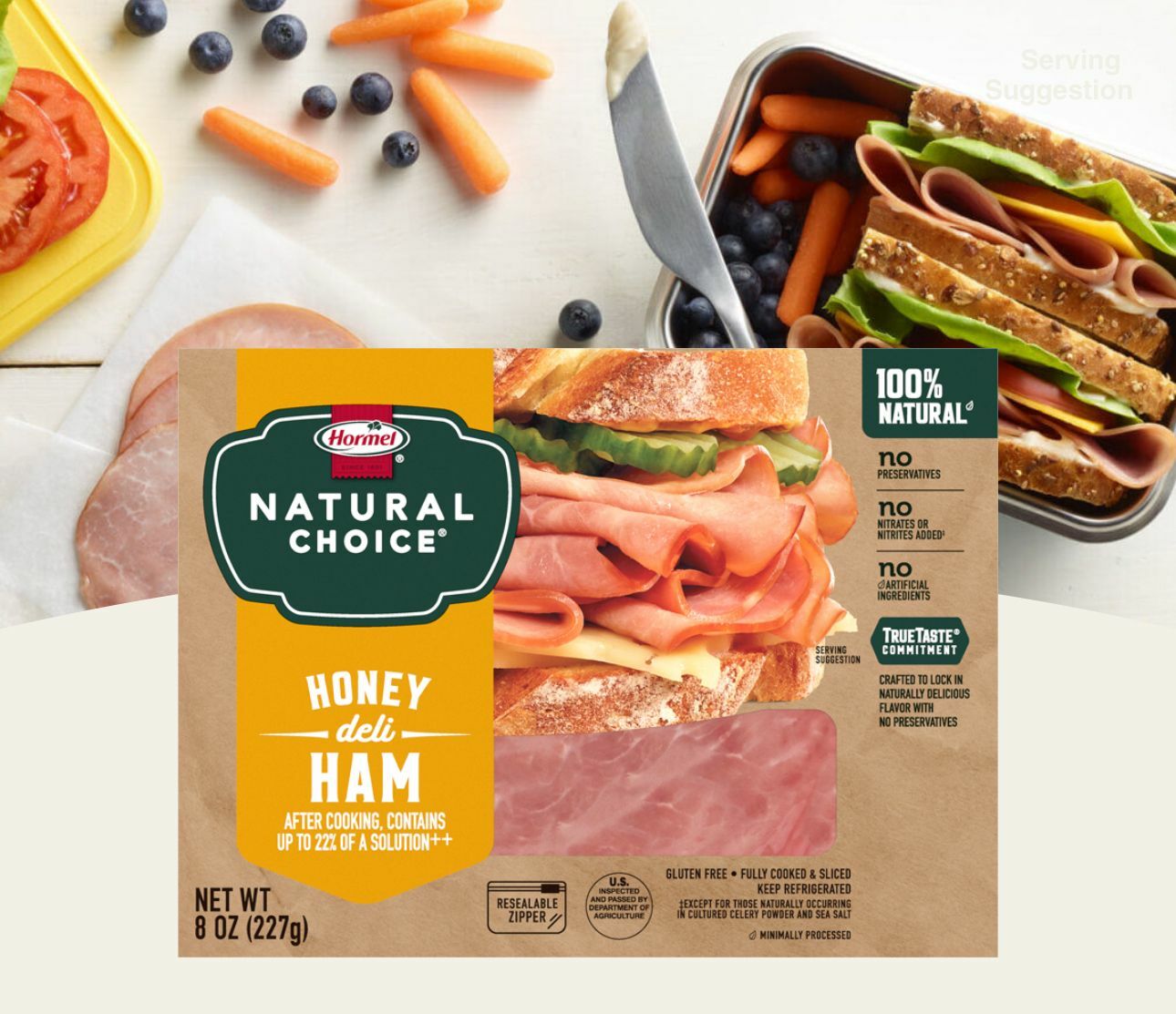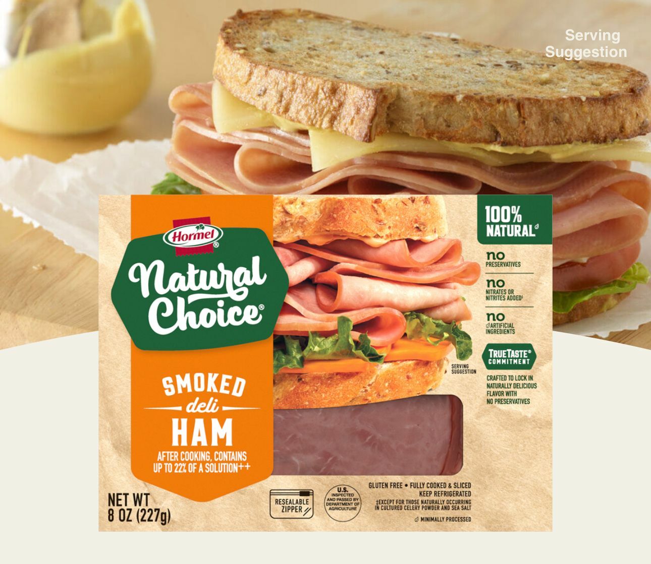 我們將熟食火腿慢烤數小時,以獲得其獨特的煙燻風味。使用 HORMEL® NATURAL CHOICE® 100% 天然(最低限度加工,不含人工成分) HORMEL® NATURAL CHOICE® 切片煙燻熟食火腿採用方便的可重新密封包裝以保持新鮮。